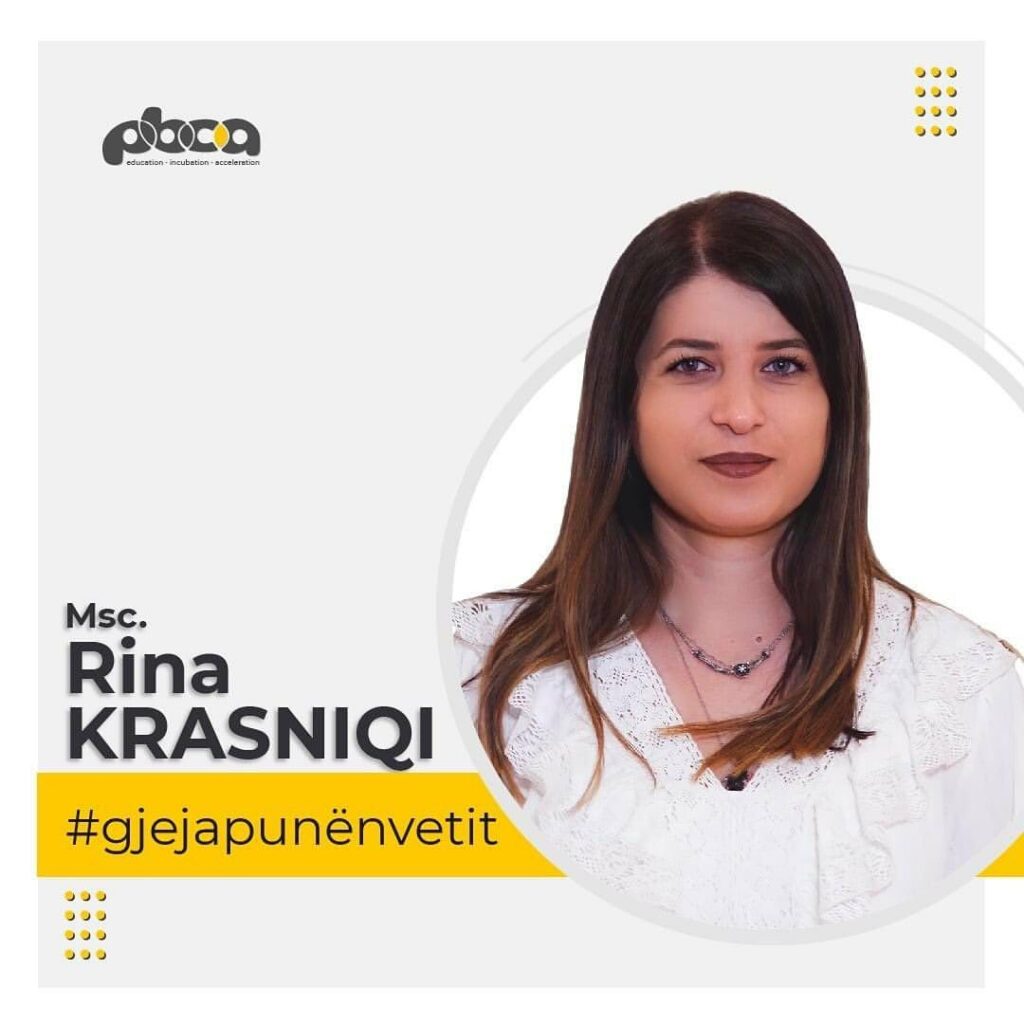 Rina Krasniqi është Menaxhere e Projekteve dhe Inxhiniere i Zhvillimit të Softuerëve në PBC. Ajo mbaroi studimet universitare, Master për "Blockchain" dhe Bachelor, në Universitetin e Prishtinës, Fakultetin e Inxhinierisë Elektrike dhe Kompjuterike.